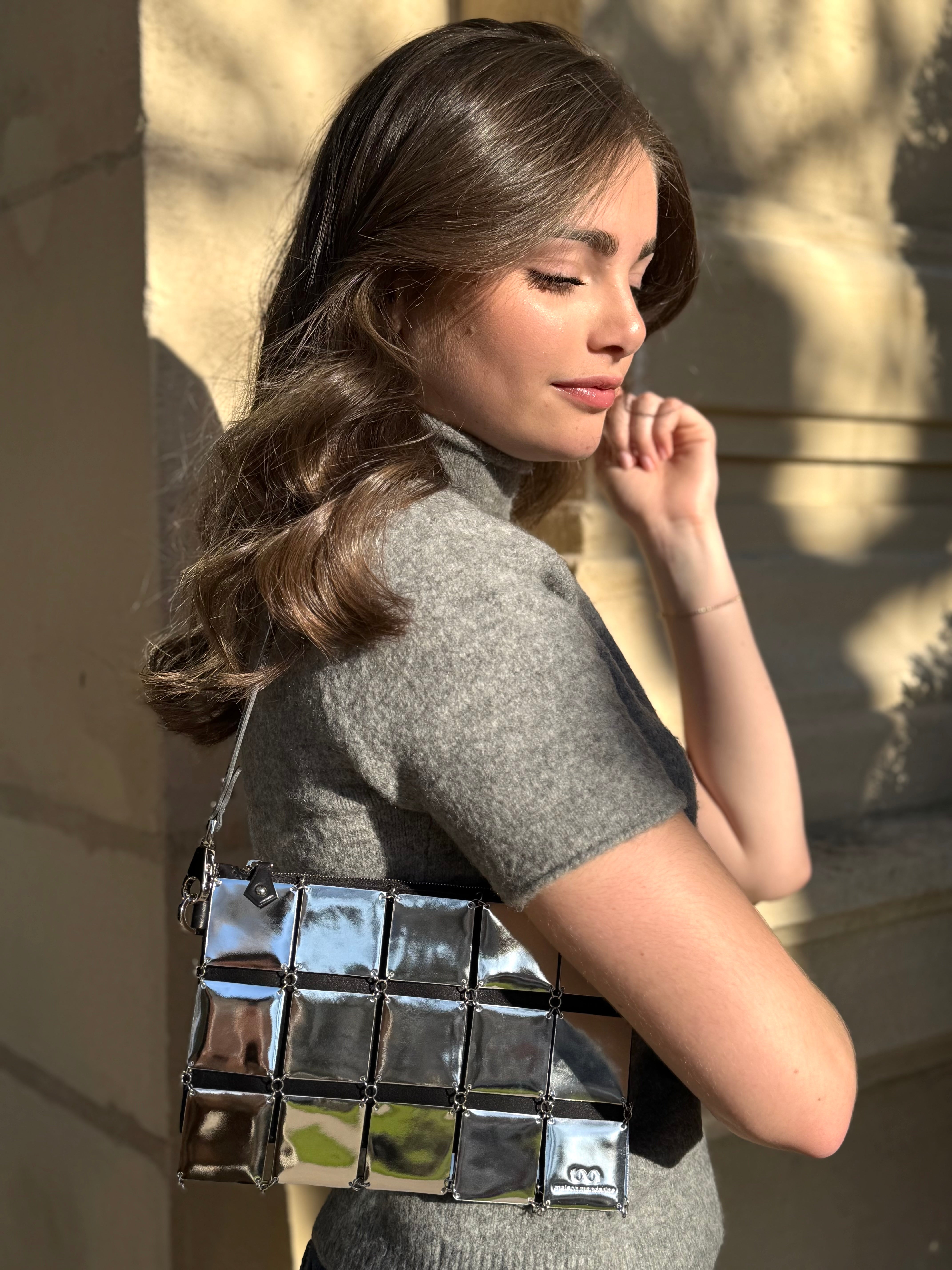 Son cuir miroir capte la lumière et reflète l’audace de celle qui la porte.